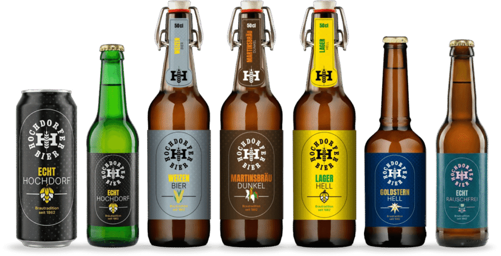 Lacierung der neuen Biere «ECHT HOCHDORF» in den 33cl-Einwegflaschen und in der 50cl-Dose, wie auch dem neuen alkoholfreien Bier «ECHT RAUSCHFREI». Weiter wurden den bisherigen Biersorten mit einem Etiketten-Update versehen.